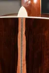 The back and sides are crafted from striped Macassar ebony, a dramatic and tonally powerful tonewood known for its piano-like clarity, strong low end, and shimmering highs. Macassar ebony adds definition and sustain, complementing the warmth of the redwood top while enhancing note separation and projection. European flamed maple binding throughout the body, fingerboard, and headstock adds a refined visual contrast that highlights the guitar’s custom nature.